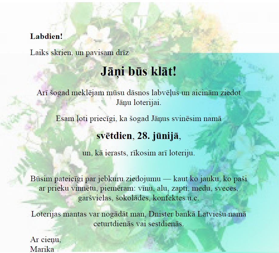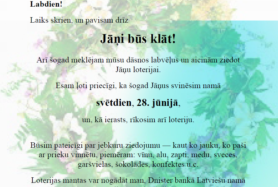 Tiem, kuri nevarēs piedalīties kopīgu Baltijas Jāņu svinībās, 20. Jūnijā – svētdien, 28. jūnijā, Sidnejas Latviešu namā notiks latviešu Jāņu svinēšana. Tas nozīmē, šogad divas iespējas svinēt Jāņus: vispirms kopā ar lietuviešu un igauņu draugiem, un pēc tam savā kopienā.