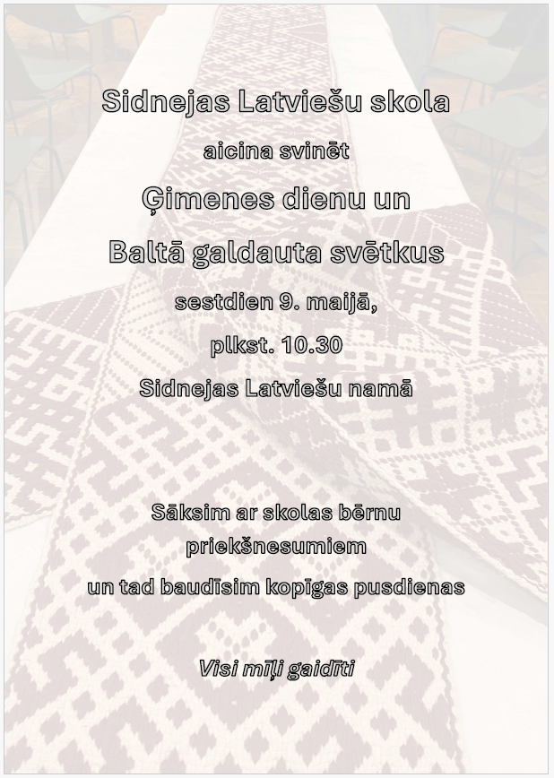 Sidnejas Latviešu skola aicina svinēt Ģimenes dienu un Baltā galdauta svētkus 9. maijāby SLBadmin29 aprīlis 202630 aprīlis 2026