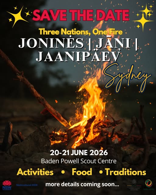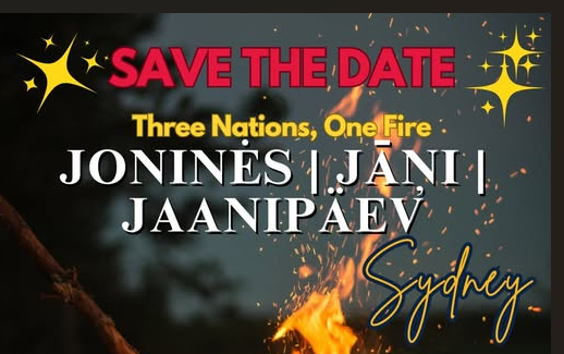 Ar lielu prieku aicinām jūs uz vēsturisku pirmo pasākumu – kopīgu Baltijas Jāņu svinību, kur vienkopus svinēs Sidnejas latviešu, lietuviešu un igauņu sabiedrības – Jāņus, Jonines un Jaanipäev.